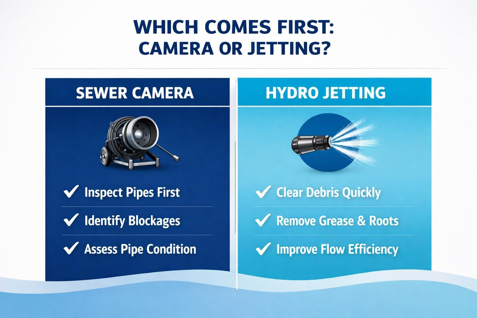 In most cases, camera first is the safer choice because it reduces unknowns. When you can see the problem, you can choose the least risky and most effective solution. That is the heart of the sewer camera inspection vs hydro jetting decision: diagnosis usually comes before heavy cleaning, especially with older pipes or recurring backups, making it essential to understand what hydro jetting is and how it works.