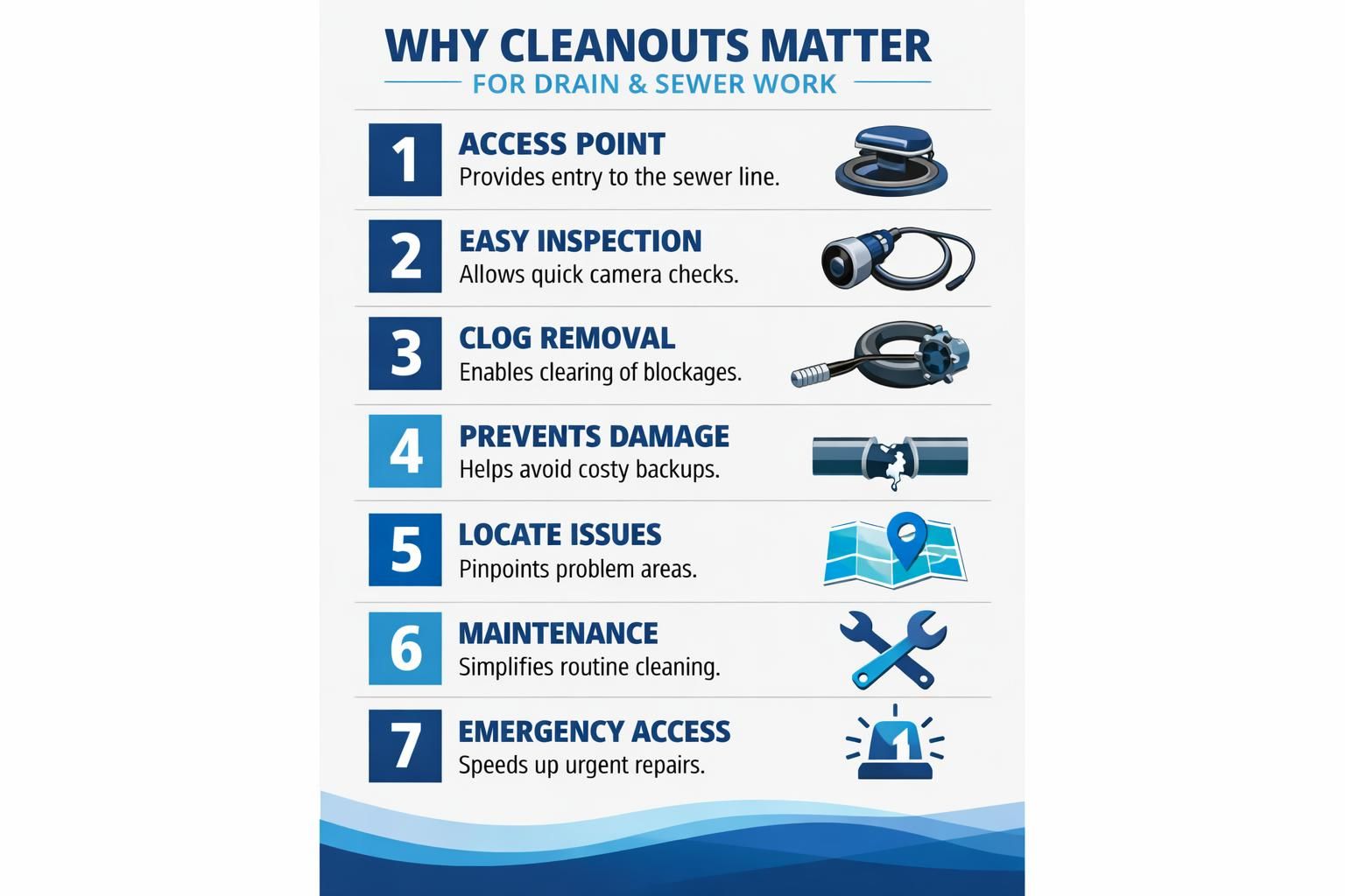 Cleanouts make drain and sewer service faster and less invasive. Without one, a technician may need to pull a toilet, open a trap, or cut pipe to gain access, which increases labor and follow-up repairs.