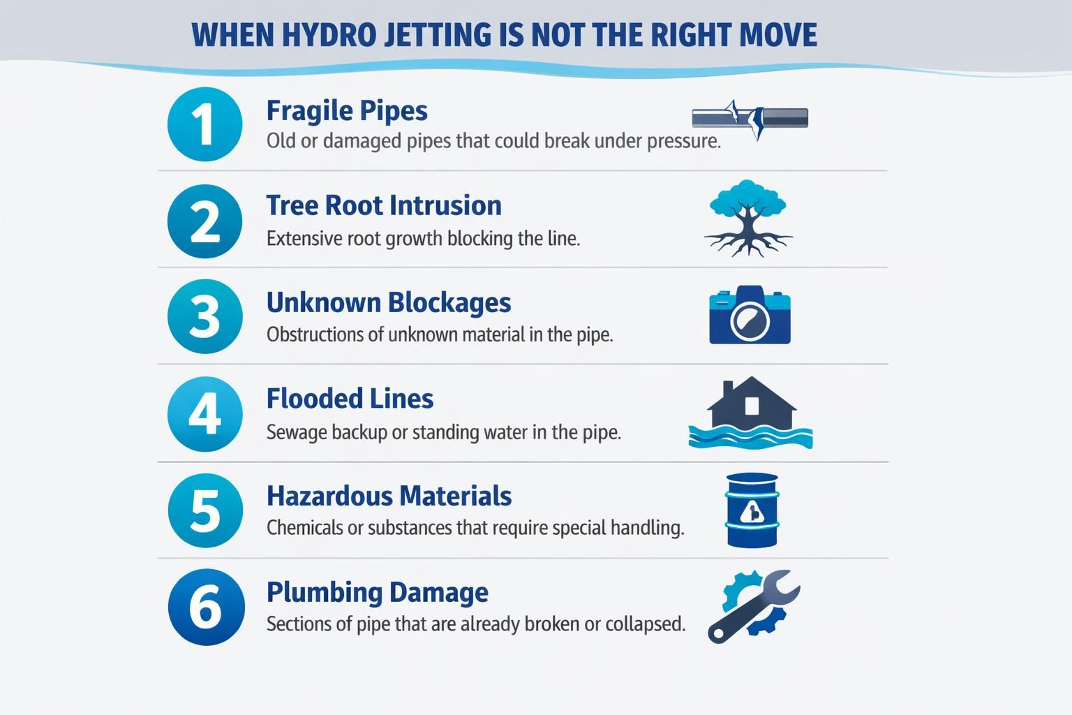 Hydro jetting is not ideal for every situation. If a pipe is severely deteriorated, cracked, collapsed, or misaligned, high-pressure water can worsen the condition. In those cases, confirming pipe integrity and addressing structural defects comes first.